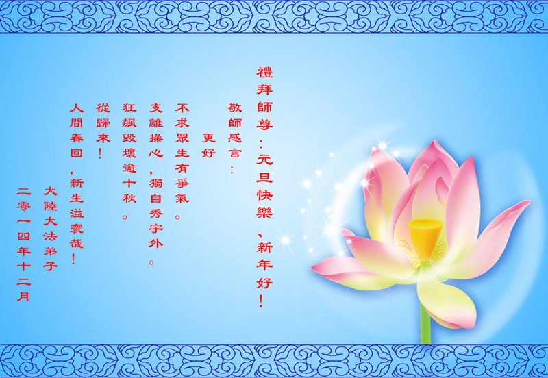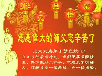 在您巨大的承受与付出中,人类又走向2015年。弟子深深体会到您的洪大慈悲,每一天的延续,都是您给予的我们全新的机会,给予众生得救的机会,给予大法弟子伟大圆满的机会。弟子唯有精進实修,达到修炼如初的状态,才真正有颜见师尊。