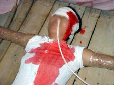 看到里面关着七、八个男人,身上就穿条短裤,赤裸裸的,满身纹身,徐金丽女士拉住门栏死活不肯进去。这帮恶人就抓头发、打耳光,乱打她的身体,后来把她手背肉打开了、打碎了,骨头也凸起来了,一双手肿得比两个大馒头还要大,全身青一块紫一块的。这些恶人还骂怨她,说影响他们睡午觉。