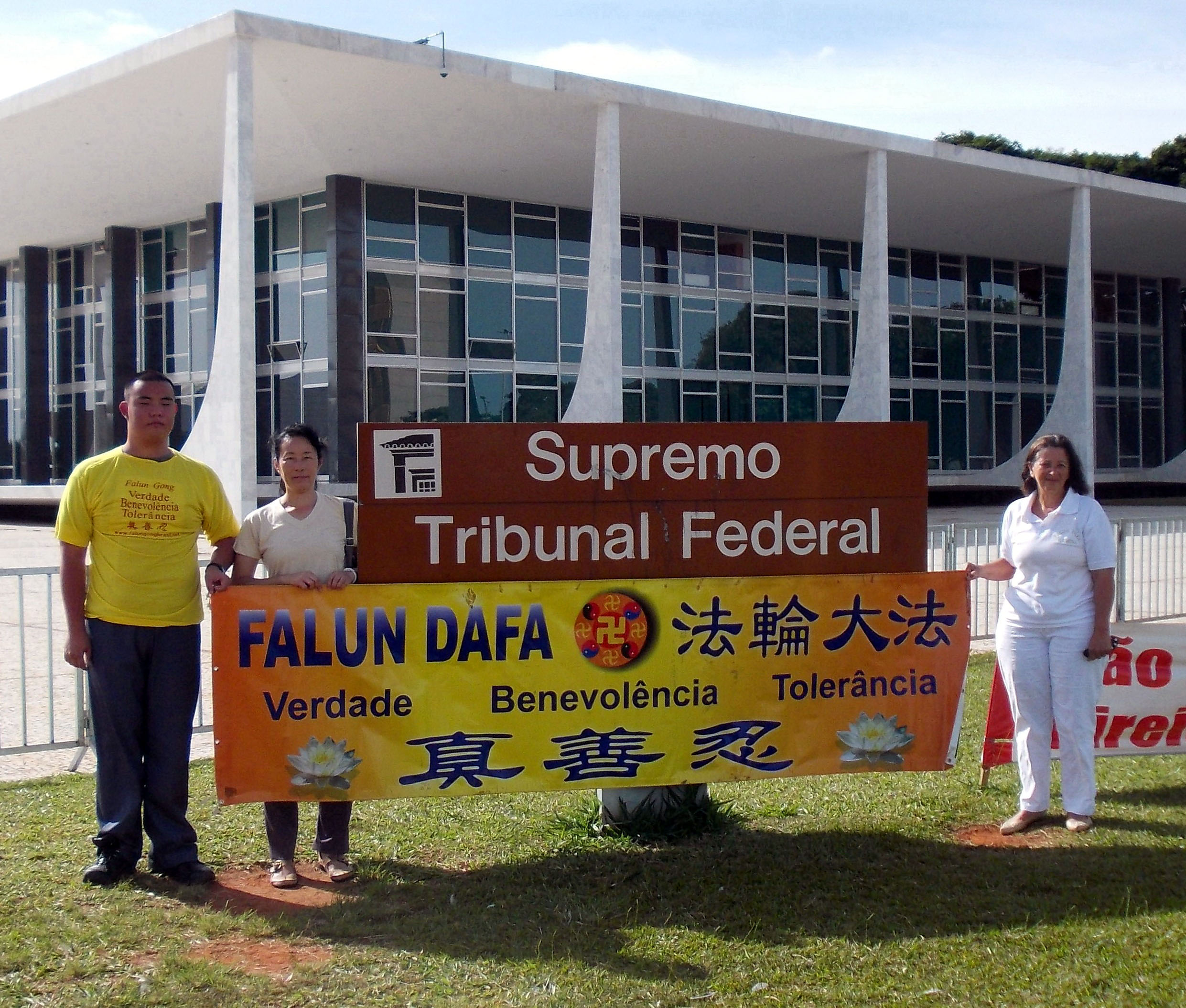 二月四日,学员们在各部门散发真相资料后,于上午十点在巴西的政治象征三权广场集体炼功。三权广场的周围是巴西行政机构中拥有最后决策权的三个部门,即总统府、国会大楼和最高法院,这三个部门象征着巴西的政治中心。
