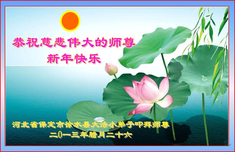 北戴河一企业总经理携全体员工恭祝慈悲伟大的李大师新年快乐:“我们明白了真相之后,在工作中尽量能够做到为别人着想,企业的业绩蒸蒸日上,经济效益出奇的好,我们知道是李大师对我们的恩泽,知道是大法慈悲与我们。我们会一如既往向世人证实法轮功是真正伟大的正法。”