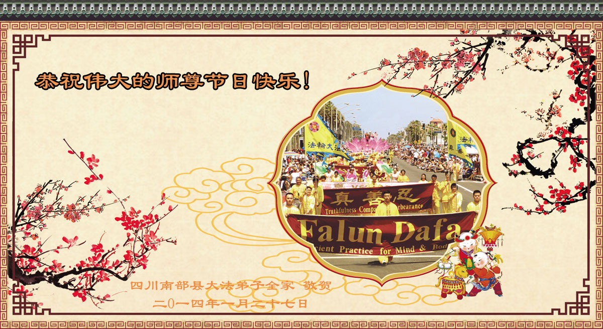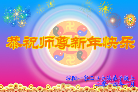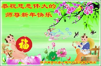 四川德阳一位商人携家人恭祝李大师新年快乐:“我们虽还没修炼,但我见证了父亲零六年瘫痪后,大法在他身上展现的神奇——他能走能动了,血压正常,血糖正常,医生都说是奇迹。我开快餐店,坚持用真相币,也向真、善、忍看齐,做良心商人,不用地沟油,不买两元一斤的瘤子肉,不以次充好。我们感谢大法师父,知道修大法的人都是世上最好的人,都支持法轮功!”