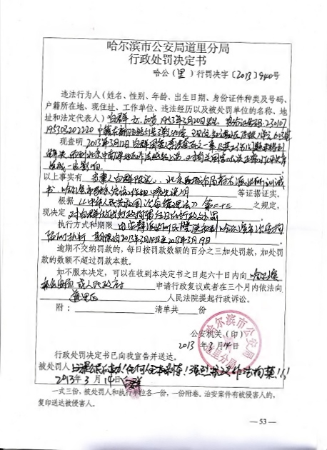 二零一三年中共两会期间,白群女士去医院开药又有人跟踪。在万般无奈的情况下,白群摆脱了单位、街道等部门的监控、围堵,依法去北京上访,后遭野蛮遣返。拘留前她被例行检查,黑龙江省第二医院医生直接给她开了一个入院通知书,说得住院。就是这样一个长期住院的病人,道里公安分局仍然非法批准拘留五天。