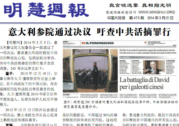 意大利参院通过决议 吁查中共活摘罪行