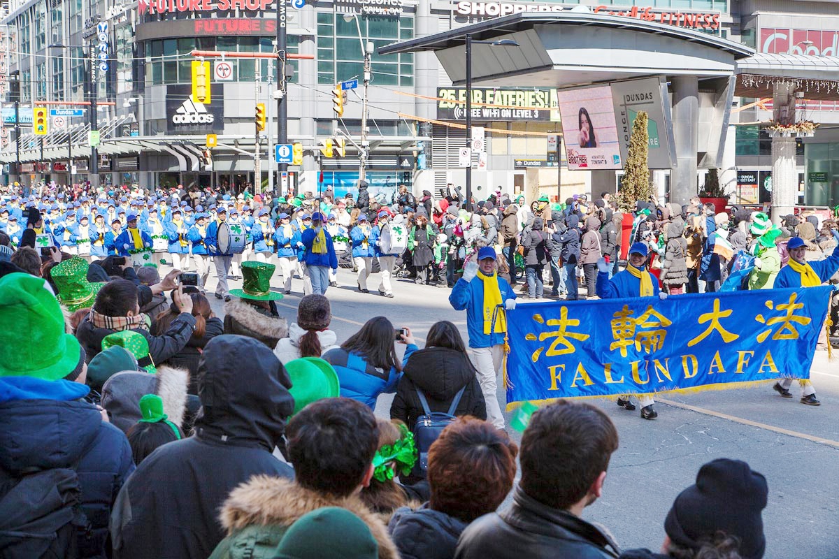 二零一四年三月十六日中午十二点,加拿大多伦多市第二十七届圣派翠克(St. Patrick)节游行在市中心隆重举行,由法轮功学员组成的天国乐团和腰鼓队连续八年应邀参加了这一年一度的盛大游行,受到道路两旁中西方观众的欢迎。