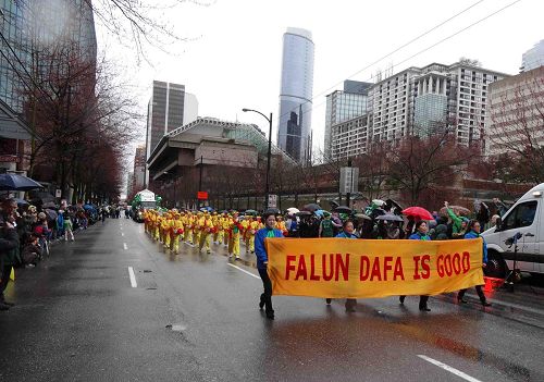 ![]() 温哥华法轮功学员应邀参加温哥华圣派翠克节游行,令人精神振奋的腰鼓队和精美的花车受到两旁观众的欢迎。 |