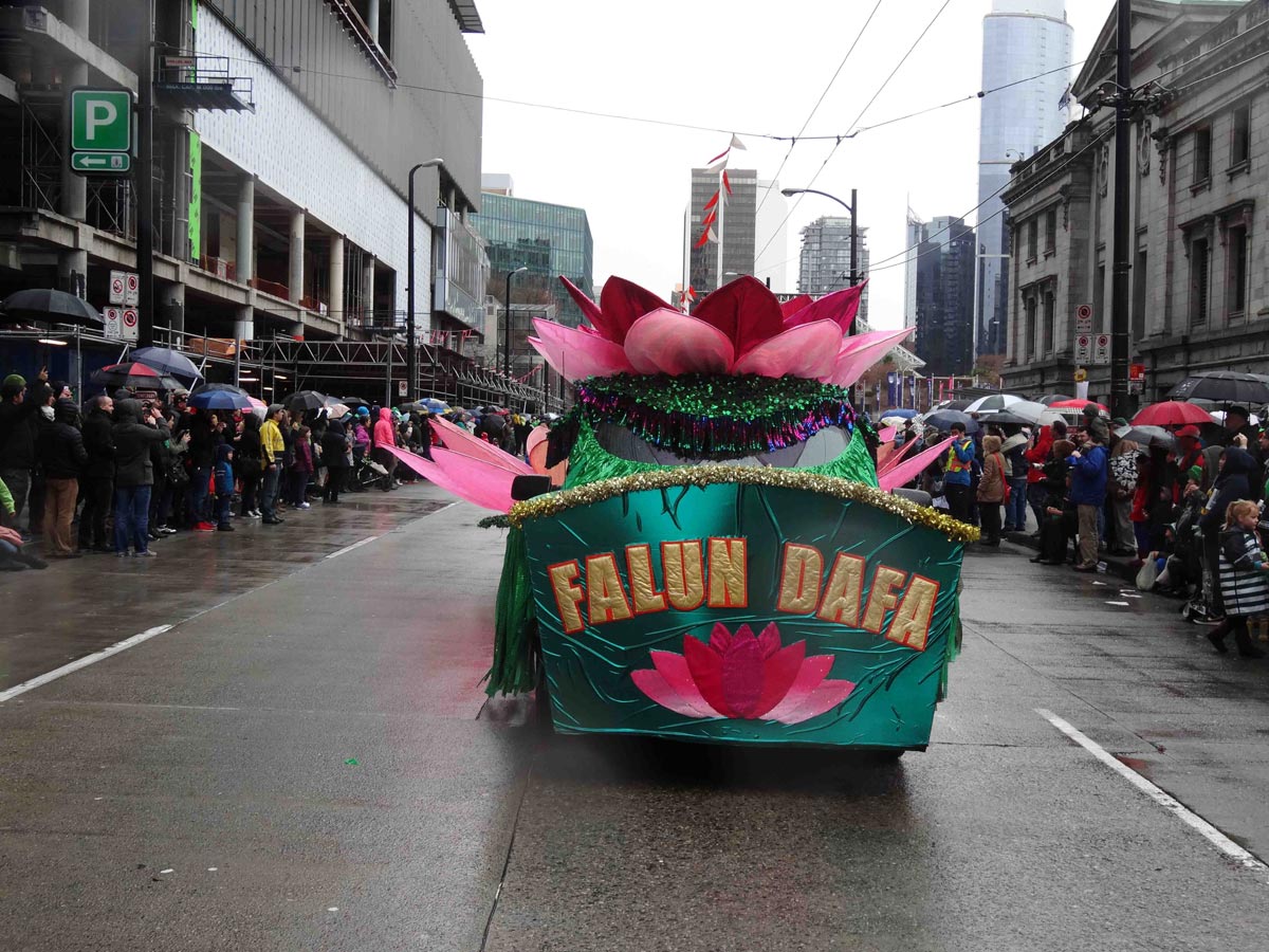 温哥华法轮功学员的腰鼓队和花车应邀参加了游行,受到沿途中西观众的欢迎。队伍经过时,不少观众拿出照相机或用手机拍照留念。