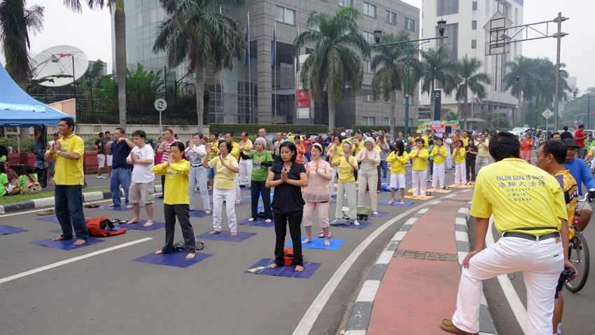 ![]() 图:雅加达法轮功学员在周日无车日集体炼功,吸引着人们的目光,并驻足了解法轮功。 |