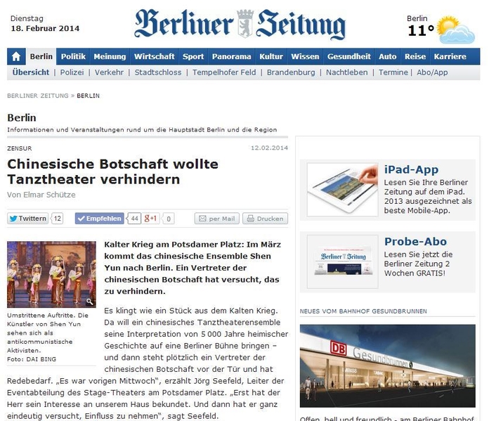 《柏林日报》(Berliner Zeitung)二零一四年二月十二日以《波茨坦广场的冷战——中国大使馆要阻止舞蹈演出》为题,曝光中共使馆因神韵艺术团将在柏林演出,派官员陈平到演出的剧场施压。文章一开始就把中使馆对神韵的干扰与前东德对艺术作品和文章的审查联系在一起。文章中写道:“自从东西德合并以来,在柏林就没有发生过对艺术领域的审查事件。但是,中共使馆却试图干扰神韵艺术团在柏林的演出。”