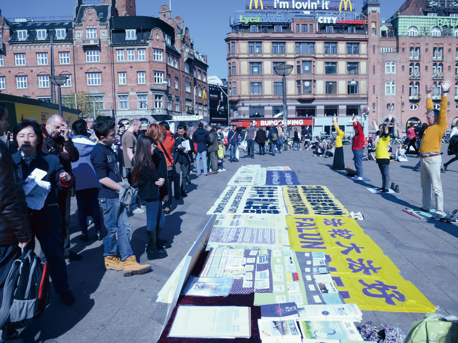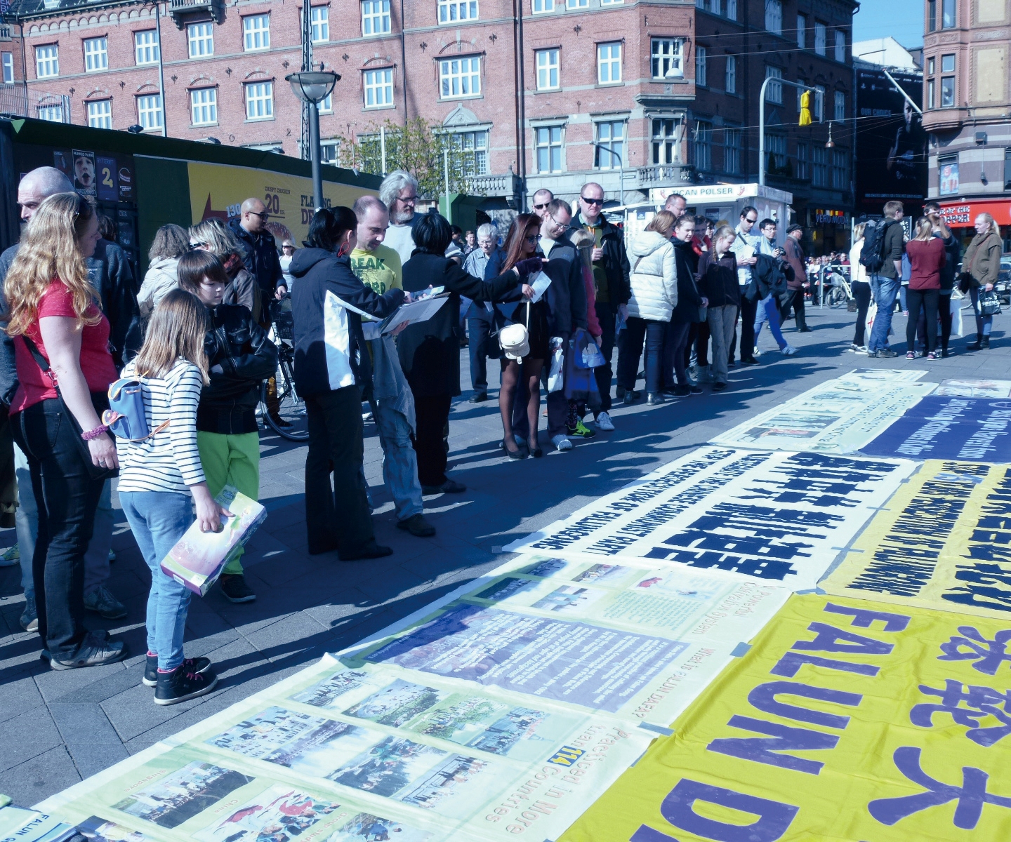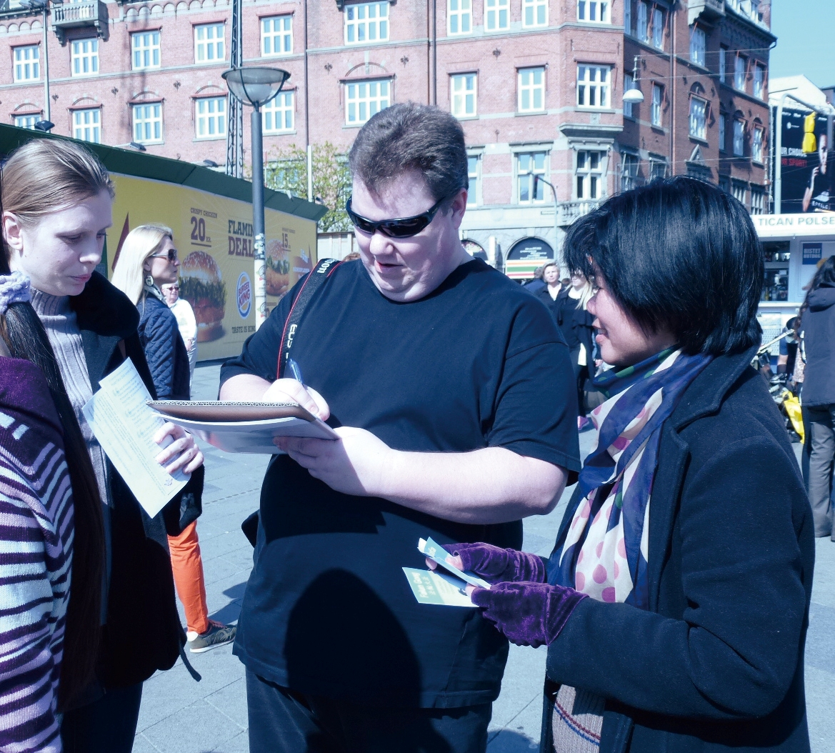 丹麦哥本哈根市政厅广场,游客签名谴责中共迫害法轮功