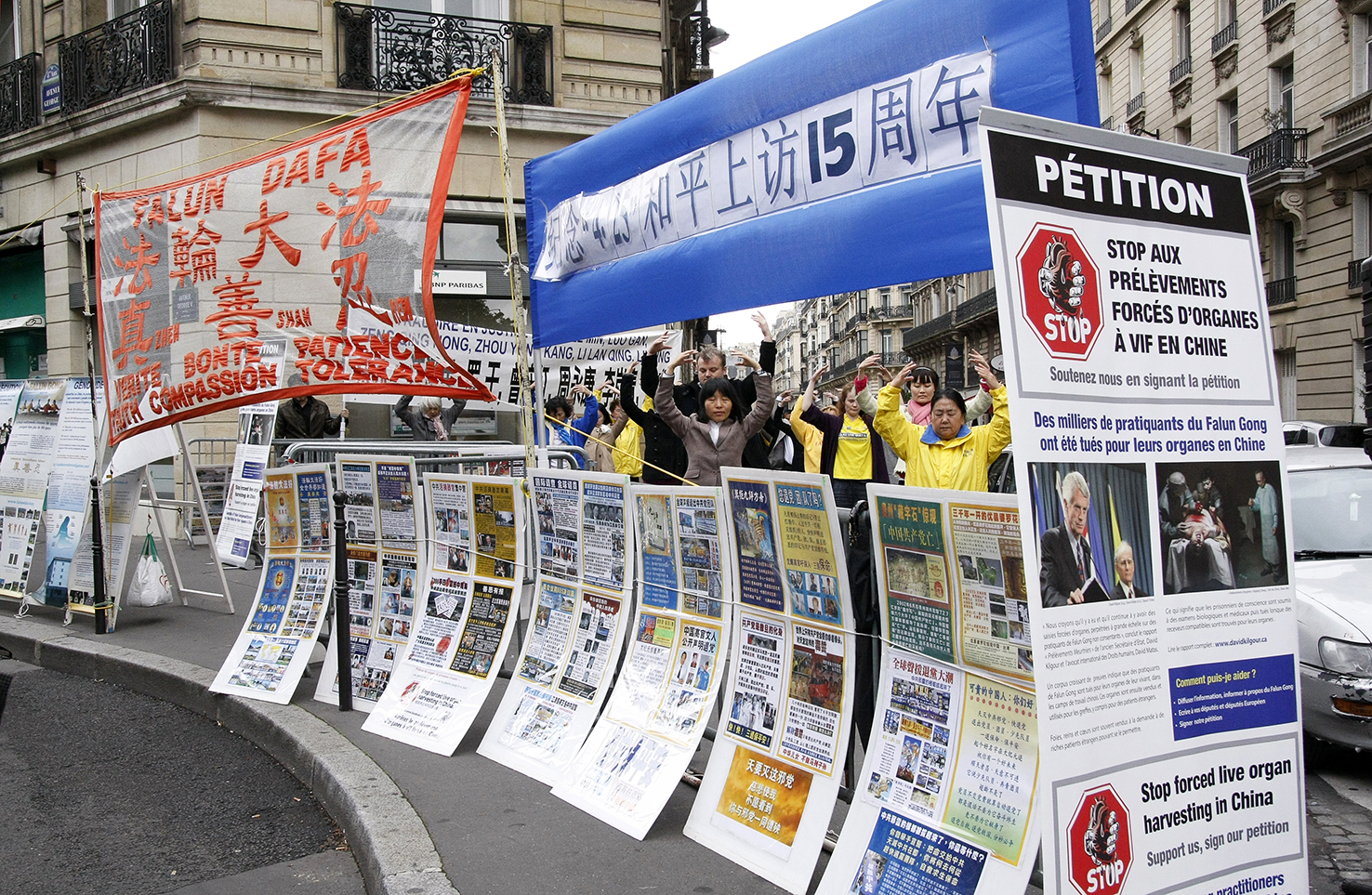 法国法轮大法协会主席唐汉龙先生在集会上发言说:“十五年前的四月二十五日,上万名中国法轮功学员去北京和平上访,希望政府给予中国老百姓自由修炼法轮功的基本权利,事隔不到三个月,七月二十日中共则发动了对全中国法轮功学员的残酷迫害:酷刑折磨、洗脑、非法抓捕、劳教和判刑,甚至活摘法轮功学员的器官,十五年来迫害一直存在着。”他呼吁立即停止迫害,法办迫害元凶——江泽民、曾庆红、罗干、周永康等。与此同时,与会的法轮功学员则通过静坐和炼功的和平方式抗议中共的迫害。