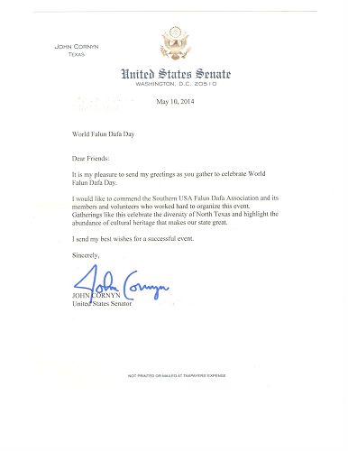 在二零一四年五月十三日世界法轮大法日之际,美国德州联邦参议员约翰•考宁发来贺信祝贺“世界法轮大法日”。考宁参议员在信中表示,在你们集会庆祝世界法轮大法日之际,请接受我诚挚的祝愿。