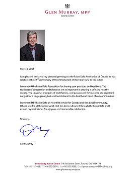 全球庆祝法轮大法传世二十二周年之际,加拿大最大省份安大略的数名厅长和省议员,向加拿大法轮大法学会发出贺信,颂扬法轮大法的“真、善、忍”理念,感谢法轮大法修炼者对社区做出的贡献,并祝庆祝活动成功。