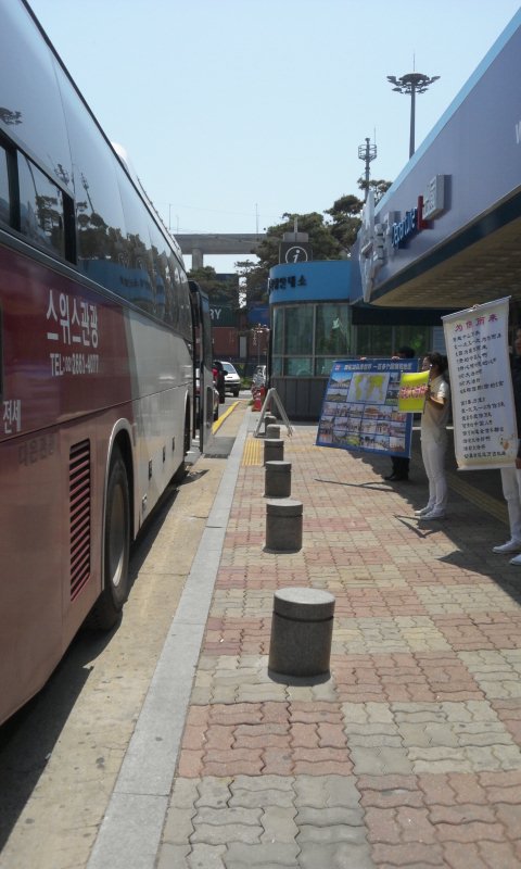 中国旅游团来韩国观光,乘坐大巴到各个景点游玩。法轮功学员把手工制作的精美莲花分别送给各个司机,好多司机高兴地把漂亮的莲花挂在大巴车上,每辆车都挂上了写有“法轮大法好”的莲花,有的挂一朵,有的挂四朵。也有好多中国游客把写有“法轮大法好“的莲花捧在手里,高兴的不得了。