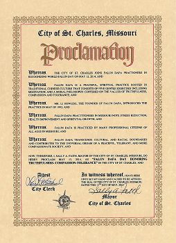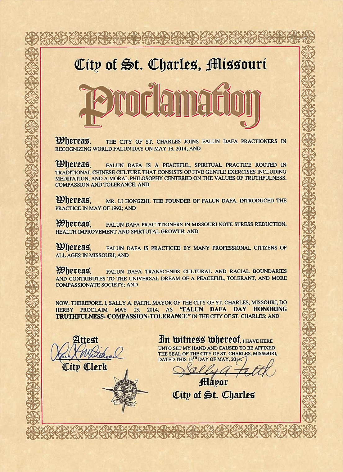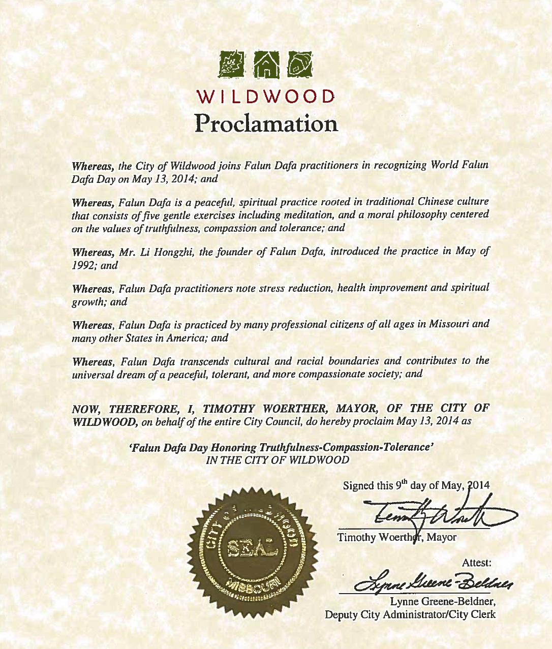 法轮大法一九九五年传入密苏里州,神奇的功效吸引着越来越多的人走入修炼。密苏里州各级政府和多个城市给法轮大法颁发了七十多个褒奖。普天同庆第十五届世界法轮大法日之际,密苏里州的维尔德吾德市(Wildwood)、圣查尔斯市(St Charles)、奥法隆市(O'Fallon)、布瑞芝顿市(Bridgeton)、州府杰斐逊城(Jefferson City)等城市都颁发褒奖,宣告二零一四年五月十三日为“颂扬真、善、忍的法轮大法日”。