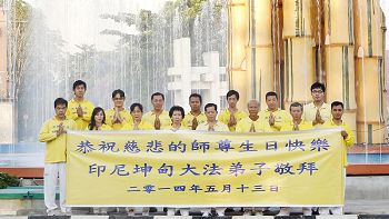 【明慧网二零一四年五月十一日】二零一四年五月十日下午,台湾台中市法轮功学员聚集于台中市政府广场集体炼功,庆贺“五·一三”世界法轮大法日来临,并用最纯净的心恭祝师尊李洪志先生生日快乐。