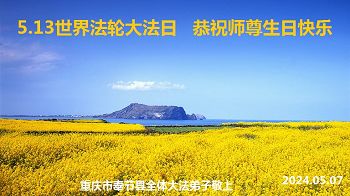 看到越来越多的中国民众明真相,选择美好未来,韩国天安市法轮功学员倍感欣慰,也更加感恩法轮功创始人李洪志先生的付出。五一三世界法轮大法日来临之际,韩国天安市法轮功学员恭祝师尊生日快乐,并表示将更努力地传播真相,把法轮大法的美好带给更多的人们。
