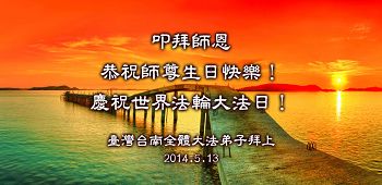 台湾台南全体大法弟子恭祝师尊生日快乐!庆祝世界法轮大法日!台湾大法弟子恭祝师尊华诞!庆祝世界法轮大法日!台北一大法弟子代大陆弟子向师父问好!祝师父生日快乐!台湾大法弟子庆祝世界法轮大法日!法轮大法好!难报师恩!香港大专院校大法小弟子恭祝师父生日快乐!恭贺大法洪传二十二周年!弟子从三岁就开始修大法,在大法中成长,在师父看护下风风雨雨走过了十七年。