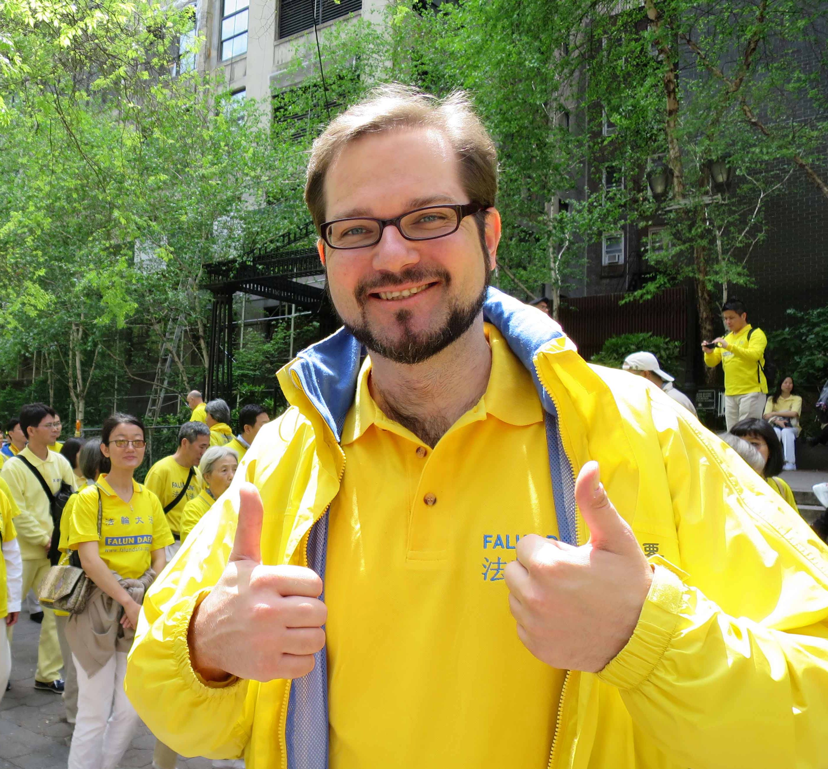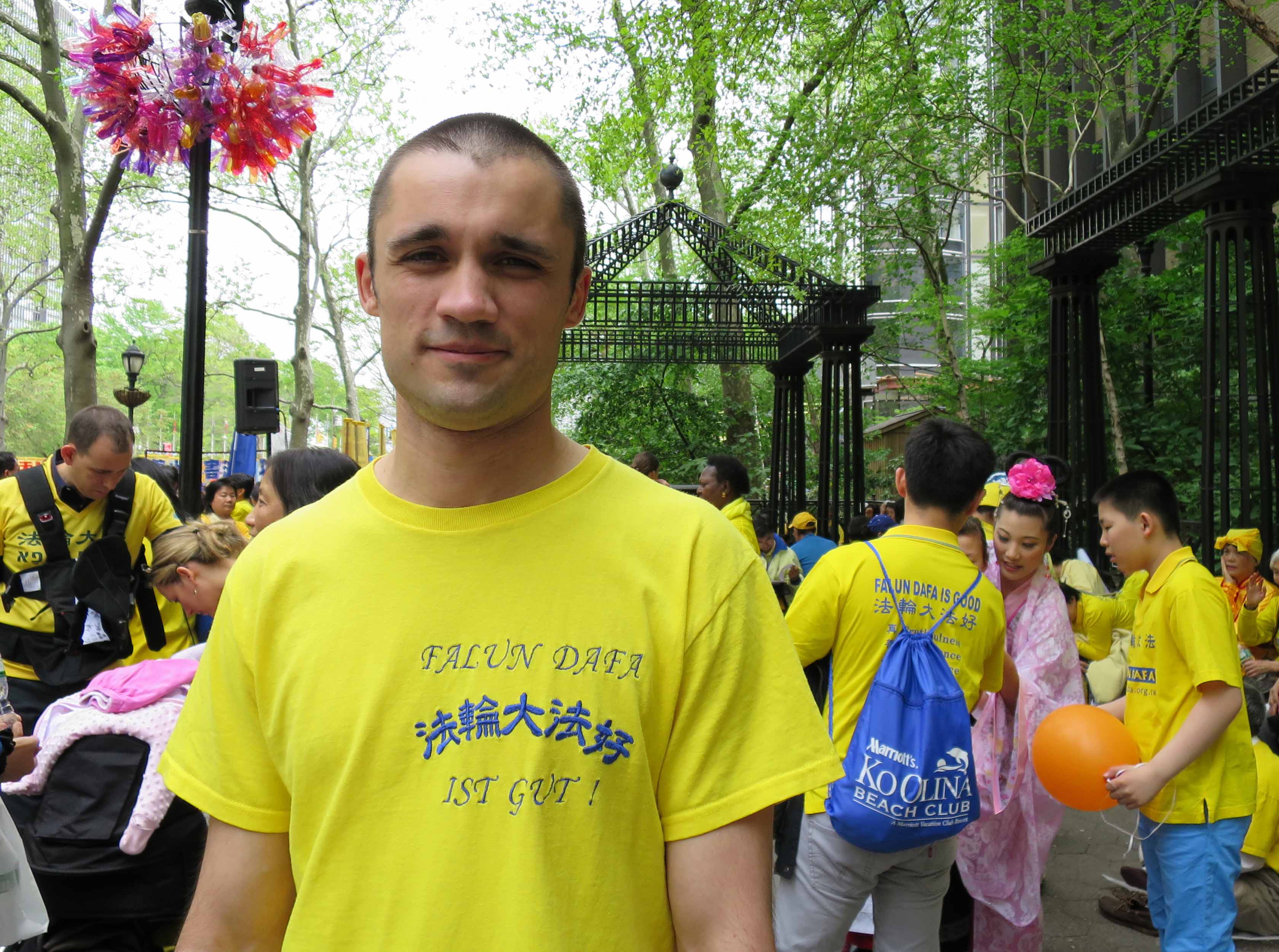 “这种感觉非常好,我们刚刚游行完,分发资料,跟路人谈法轮功真相。”来自德国柏林的法轮功学员阿尔乔姆(Artjom)说,“我来纽约是因为来参加法会,纽约是个中心,全世界的大法弟子汇集到这里,这真让我高兴。”能在纽约参加活动,揭露中共迫害法轮功的真相,让他感到高兴。