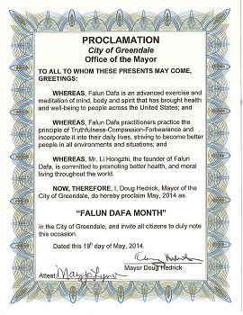 美国印第安纳州格林德尔市(Greendale,Indiana)市长道格•赫瑞克(Doug Hedrick)于二零一四年五月十九日签发褒奖令,宣布五月为“法轮大法月”。