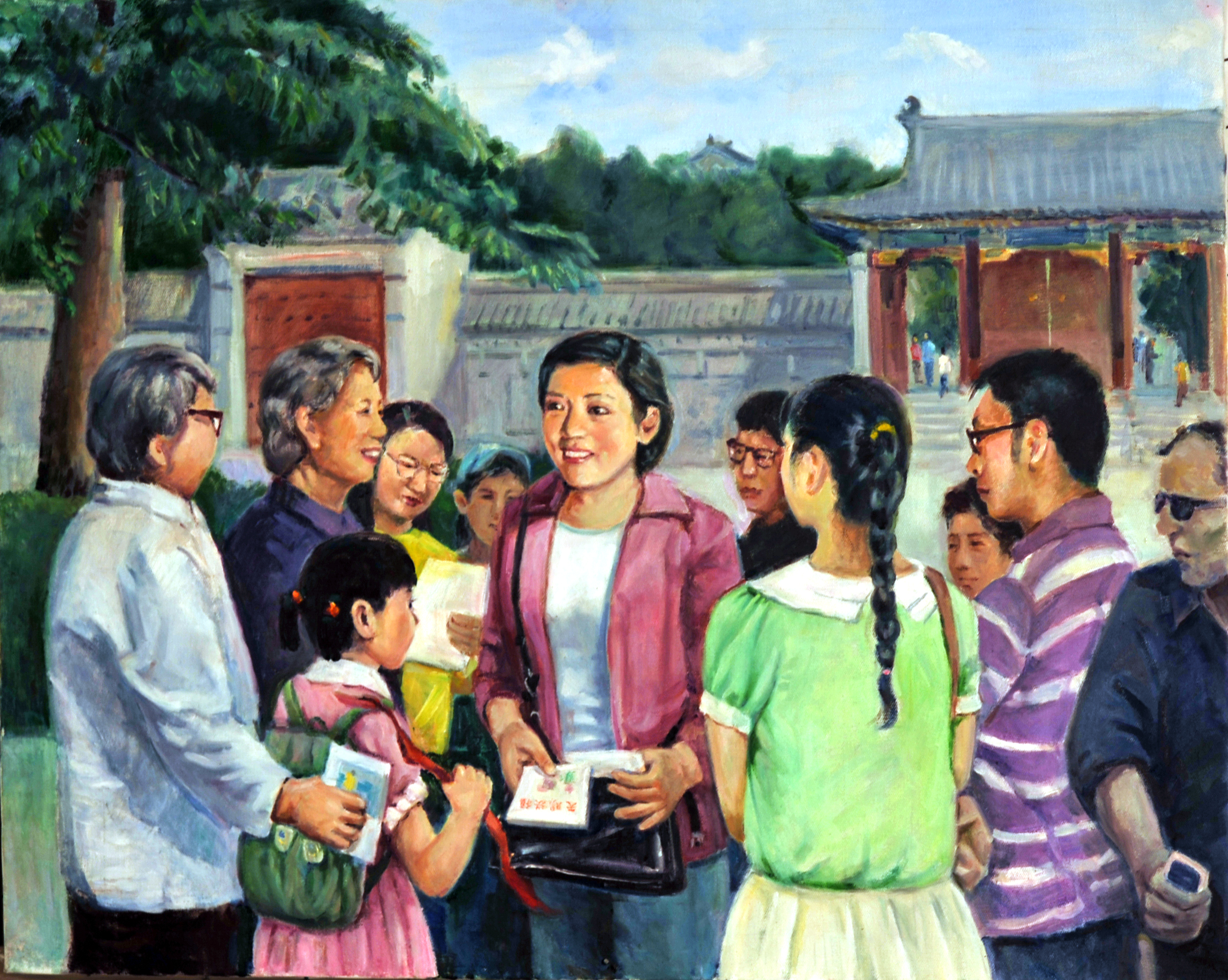注:大法弟子堂堂正正地在讲真相,把大法的美好告诉世人,小朋友听明白了,立即取下红领巾退队,大人有看真相资料,有的听清了会心地笑着三退(退出邪党团队),恶党的便衣,拿手机想举报,听完后没打,也在盼救。