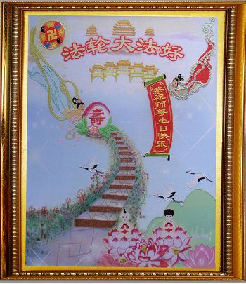 这次去另一家装裱店做镜框时,老板看到上面绣有“法轮大法好”,怎么说,他都不敢框这幅作品。交谈时,得知这老板是老干部,他经历过文化大革命、三反、五反,给整怕了,所以只答应给我做空镜框,作品自己在家装入。我来取镜框时,发现规格短了二厘米,忙对老板说:我用了三十个上午还有连续三个晚上没上床睡觉,才把这作品做完,这样框上去作品就不完整了,这种规格你能卖的出去吗? 老板说:“这规格卖不出去,不要我只好亏三百元钱了。”我说:以后做事要小心点,你们辛辛苦苦挣点钱不容易,今天我是炼法轮功了,才不计较你,换个人肯定是不会要了。同时和他讲真相,老板明白了真相也看到了大法弟子那颗善良的心,宁愿自己吃亏,也不去为难别人。他马上把这幅作品框好,并发自内心的高喊“法轮大法好!”他们店里的员工也都做了三退,全部接受了大法真相资料。
