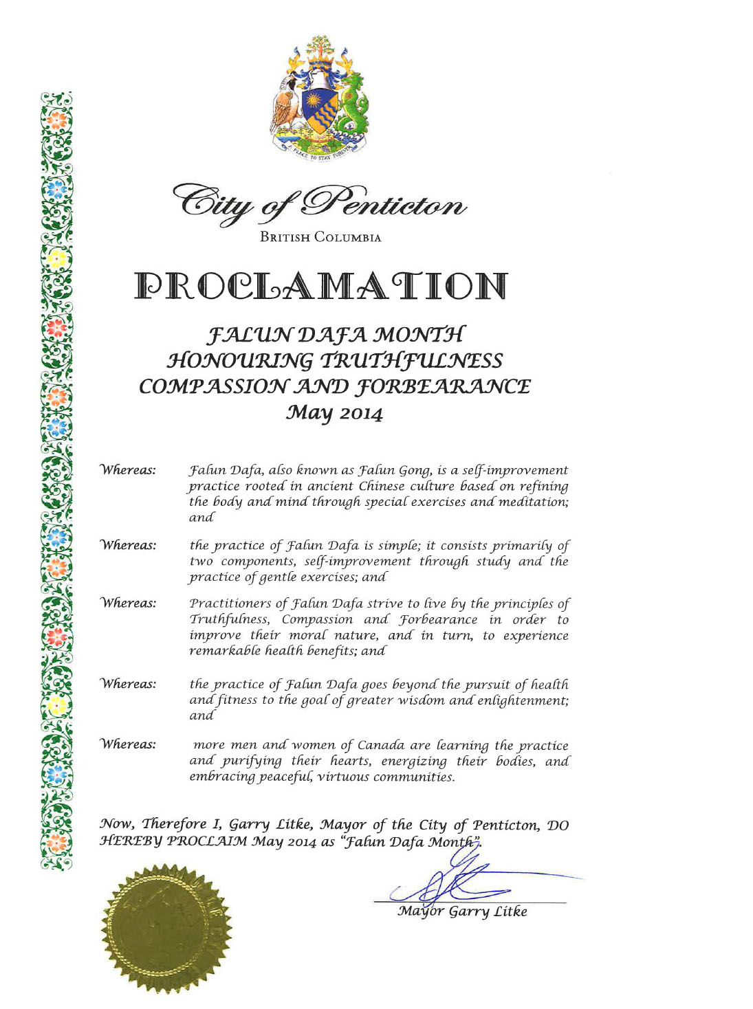 二零一四年四月二十九日,加拿大卑诗省(British Columbia)潘提克顿市(Penticton)市长宣布五月为“法轮大法月——颂扬真、善、忍”。