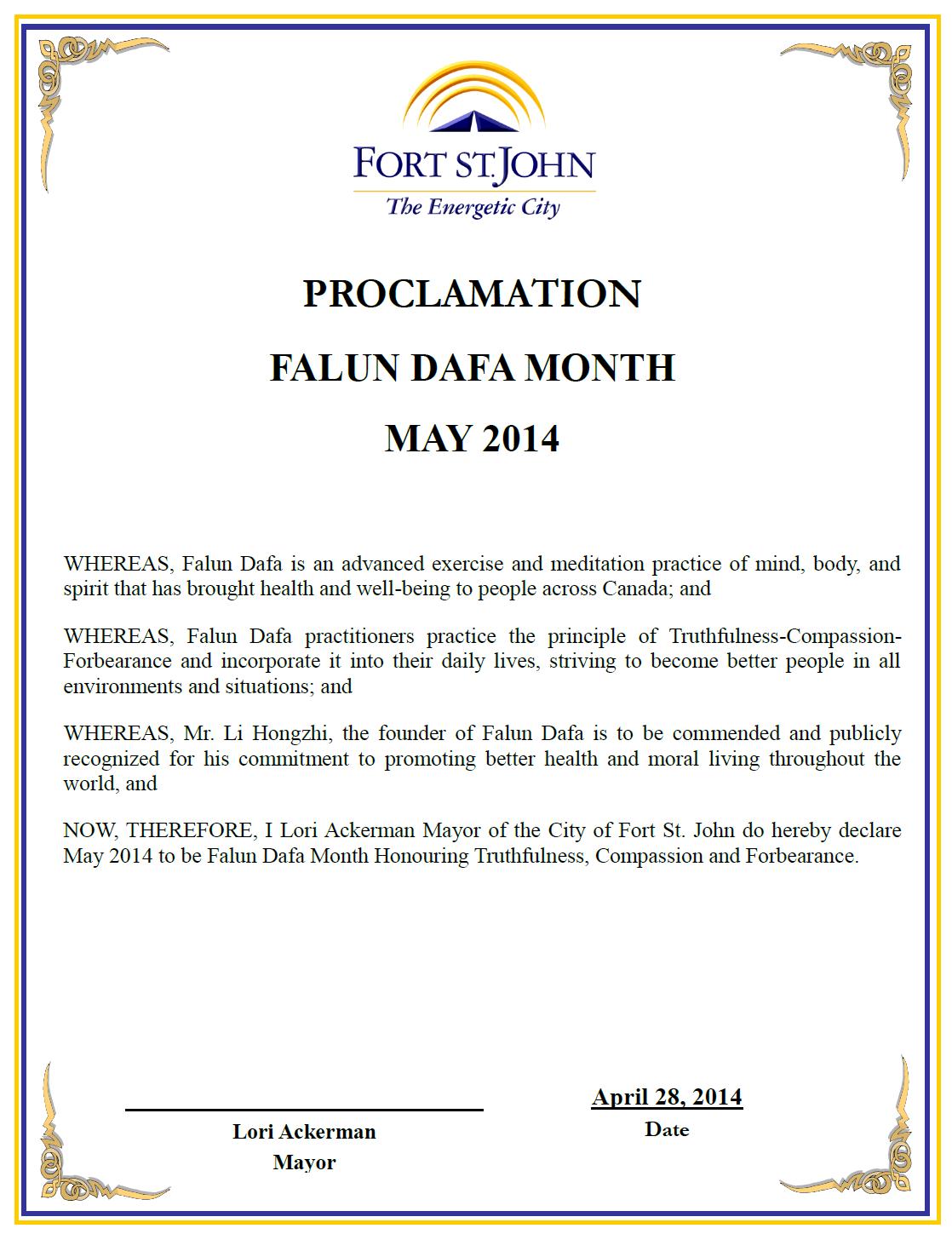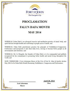 二零一四年四月二十八日,加拿大卑诗省(British Columbia)圣约翰堡市(Fort St. John)市长宣布五月为“法轮大法月”。