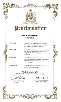 二零一四年五月一日,加拿大卑诗省(British Columbia)基隆拿市(Kelowna)市长宣布五月为“法轮大法月”。