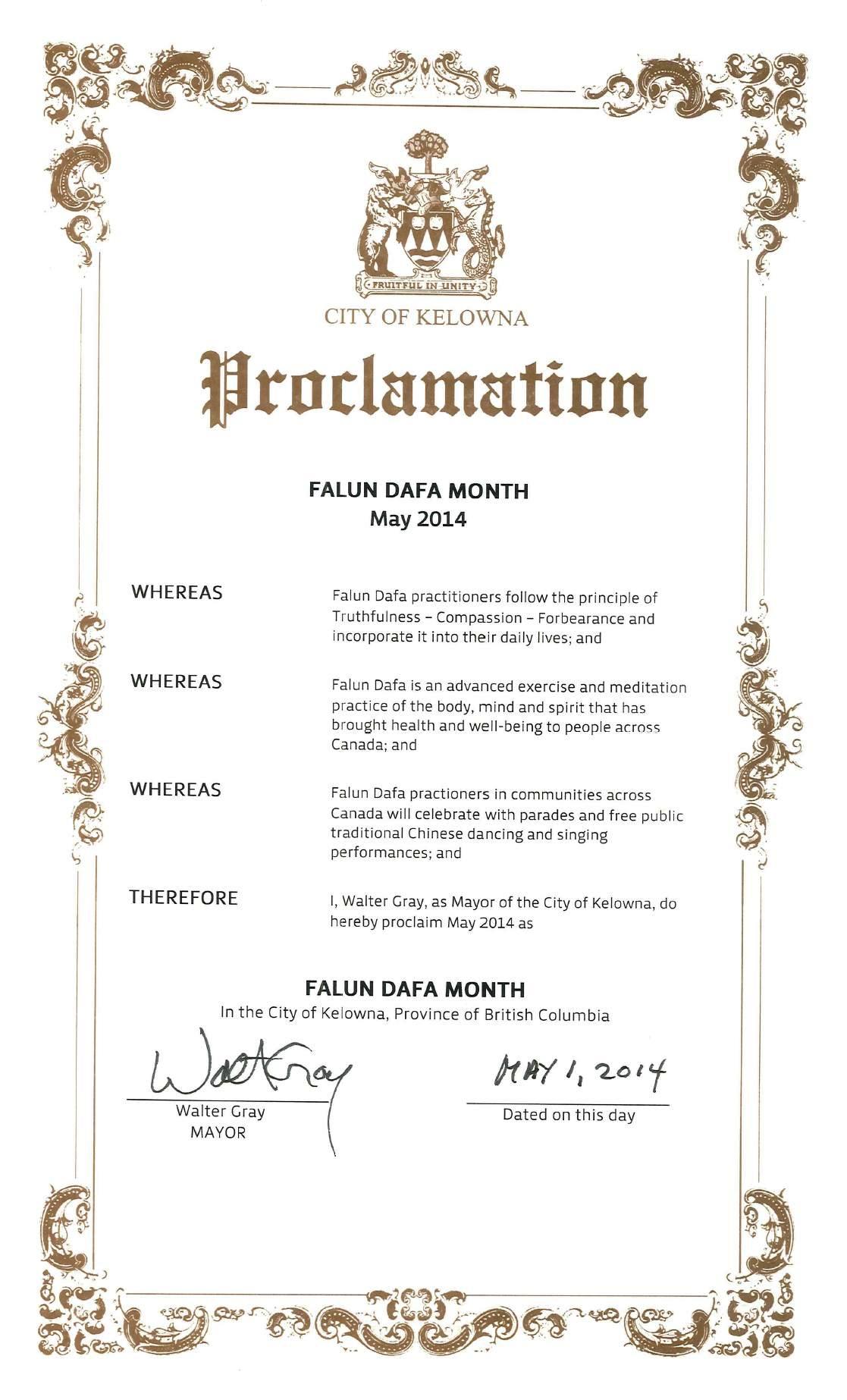 鉴此,我,基隆拿市市长沃尔特•盖瑞(Walter Gray),特此褒奖二零一四年五月为基隆拿市“法轮大法月”。