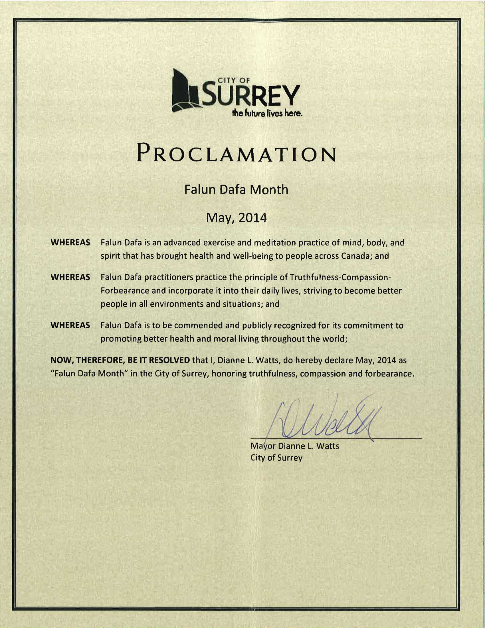 我,戴安娜•沃兹,作为素里市市长,特此宣布二零一四年五月为素里市“法轮大法月—颂扬真、善、忍”。