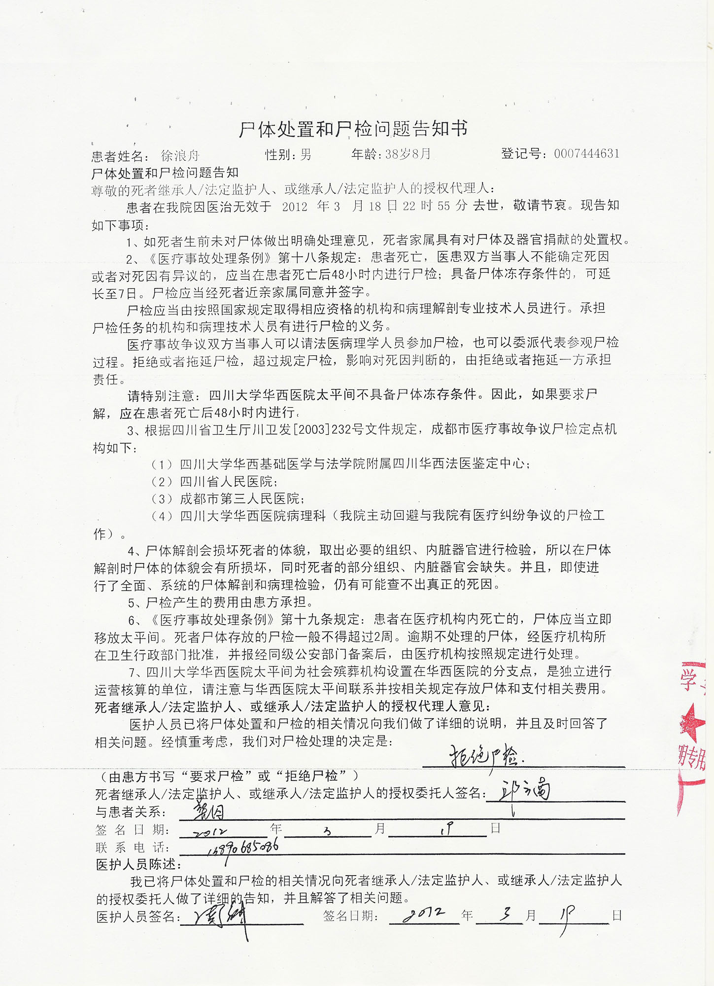 在徐浪舟离世的第二天(2012年3月19日),乐山五马坪监狱便瞒着家人,擅自签字拒绝尸检(如图,邱云南为五马坪监狱九监区副监区长,该监区为入监队)。随后,乐山检察院又当面向家属撒谎:“我们已经做了尸检,是正常死亡。”可当家人要求看报告时,检察官顿时哑口无言并低下了头。
