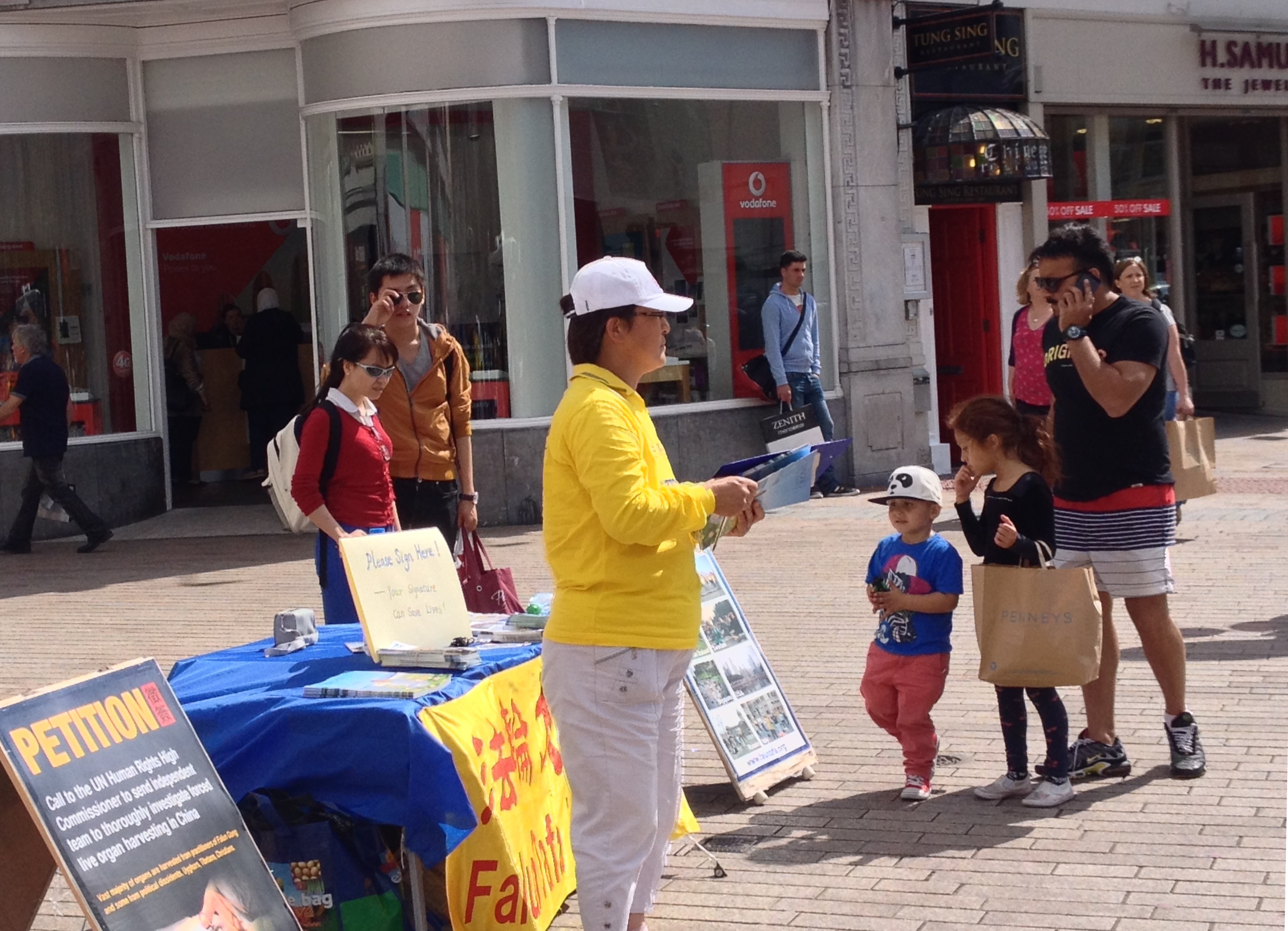 住在科克市的梁陈女士来自香港,和儿子来爱尔兰已经七年了。她表示自己在香港就知道法轮功,并表示要学炼法轮功。梁陈女士表示自己身体不是很好,本来想学一种气功,结果发现那套气功的动作过于复杂繁琐。通过当场和法轮功学员的交谈,她发现法轮功的动作简单易学,尤其当法轮功学员向她介绍迫害前大陆有一亿人炼法轮功,法轮功对祛病健身有奇效后,梁陈女士兴奋地说:“我女儿在英国,我要让我女儿也炼法轮功!”临别前,梁陈女士特地记下了当地和都柏林法轮功学员的联系方式,表示回家后要马上开始学功。