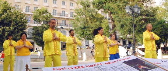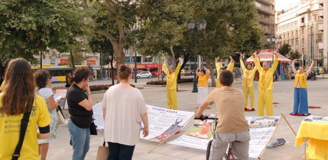 【明慧网二零一四年六月二十九日】二零一四年六月十八日,希腊雅典部份法轮功学员在市中心的宪法广场(Syntagma Square),放好真相展板,拉开横幅,随着缓慢优美的炼功音乐,学员们身着黄色炼功服演示功法,祥和舒展的功法吸引着过往的市民和旅游者。很多民众驻足观看功法演示,不少人观看真相展幅,一些法轮功学员向前来咨询的雅典民众和旅游者们,讲述法轮功在中国被迫害的真相,也有不少民众来了解炼功点信息。