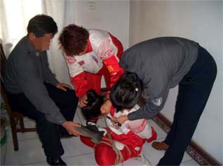 鹤岗市付亚芳女士二零零二年被闯进家门的警察绑架,后被非法劳教三年。恶警以扒光衣服、“坐小凳”、蹲铁栏杆、铐铁环、电击、“鬼剃头”、聚光灯照眼睛、奴工等摧残她。付亚芳被迫害的双腿不会走路……