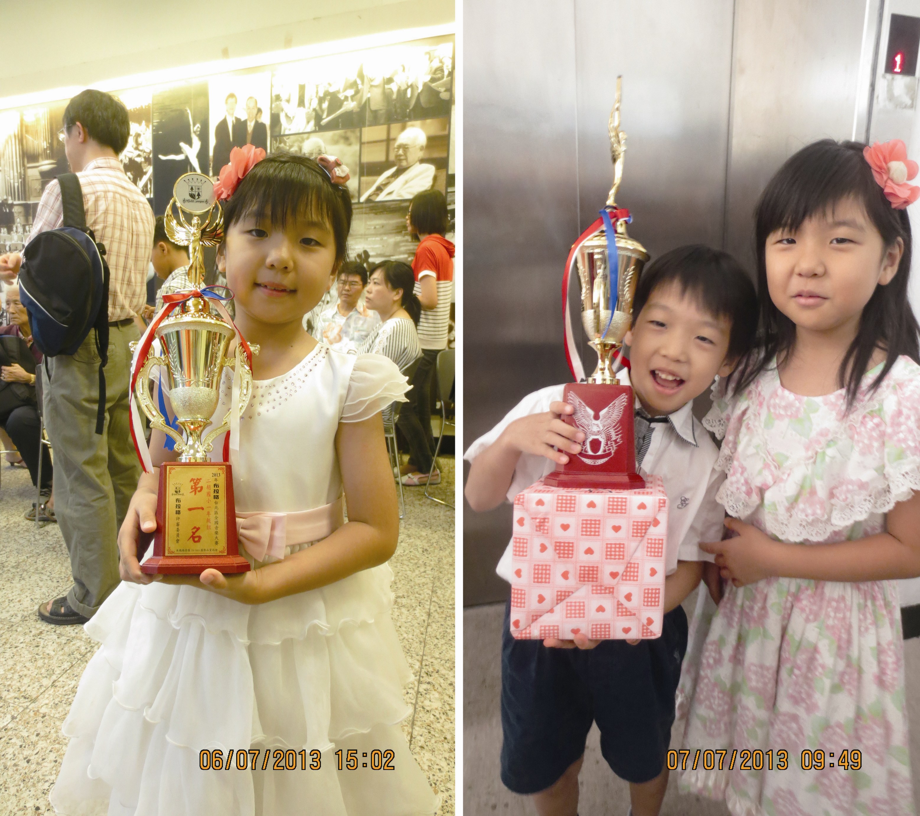 ![]() 图4. 心明演奏二胡、子明演奏钢琴,比赛获奖后抱着奖杯留影。 |