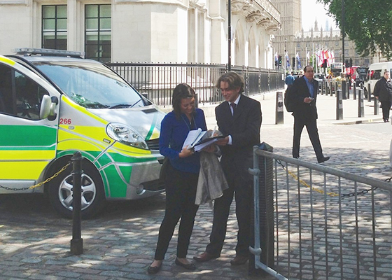 六月六日中午,正在伦敦国际移植大会会场外发放真相资料并征签的英国西人法轮功学员斯图尔特看到七、八个中国人正朝他的位置走来,他突然意识到其中一人正是追查国际通告所指的郑树森,他拿出一份通告递给了郑。