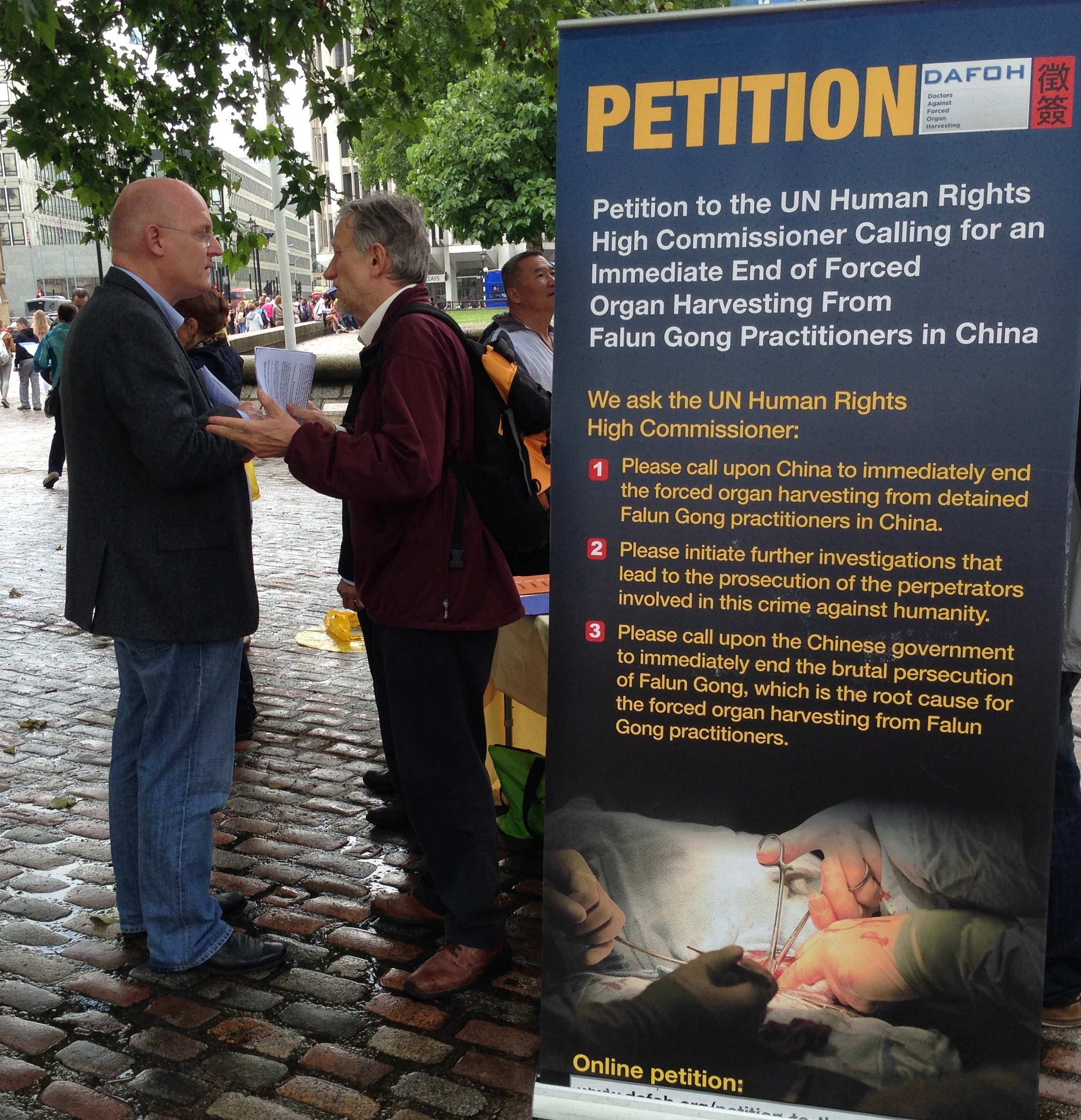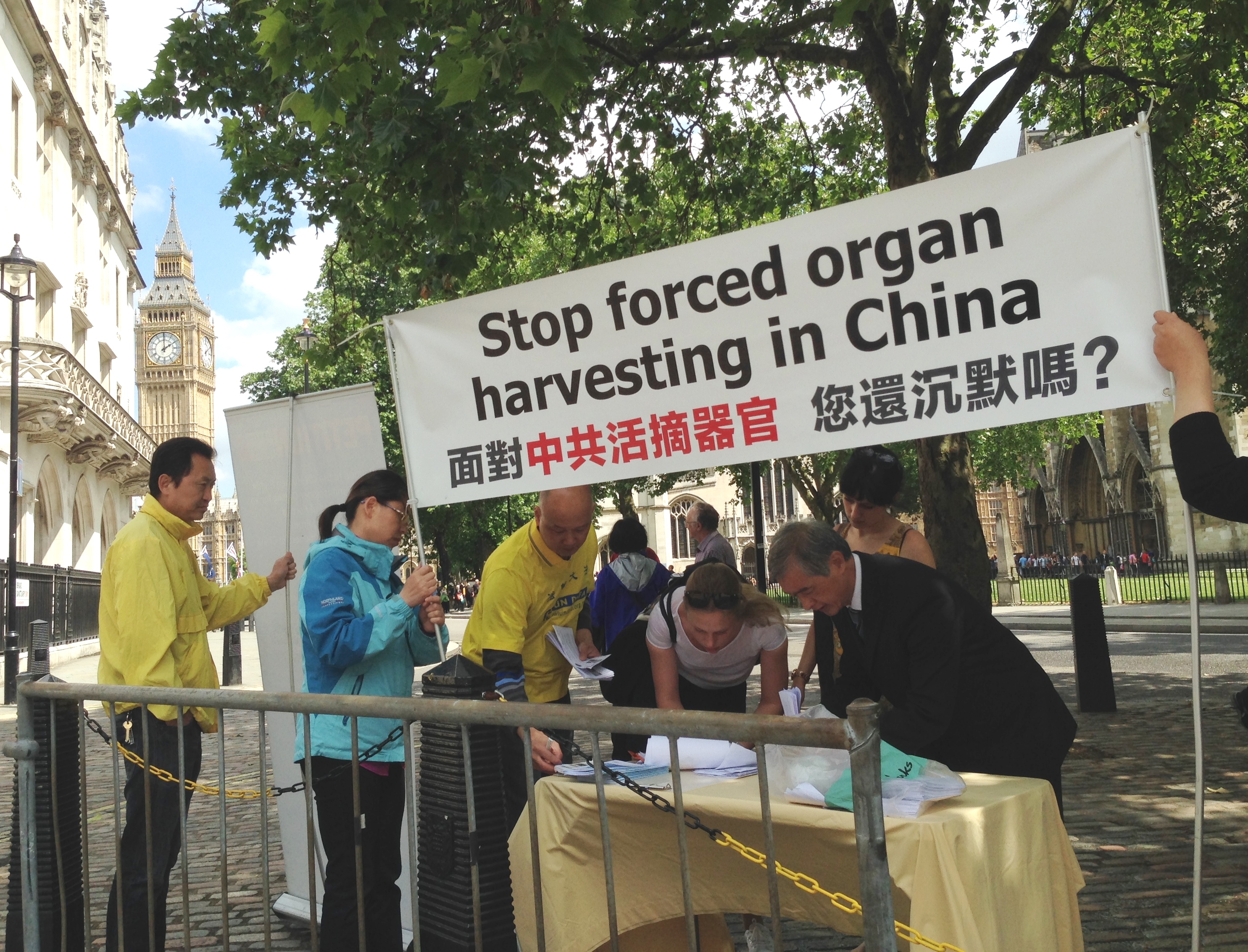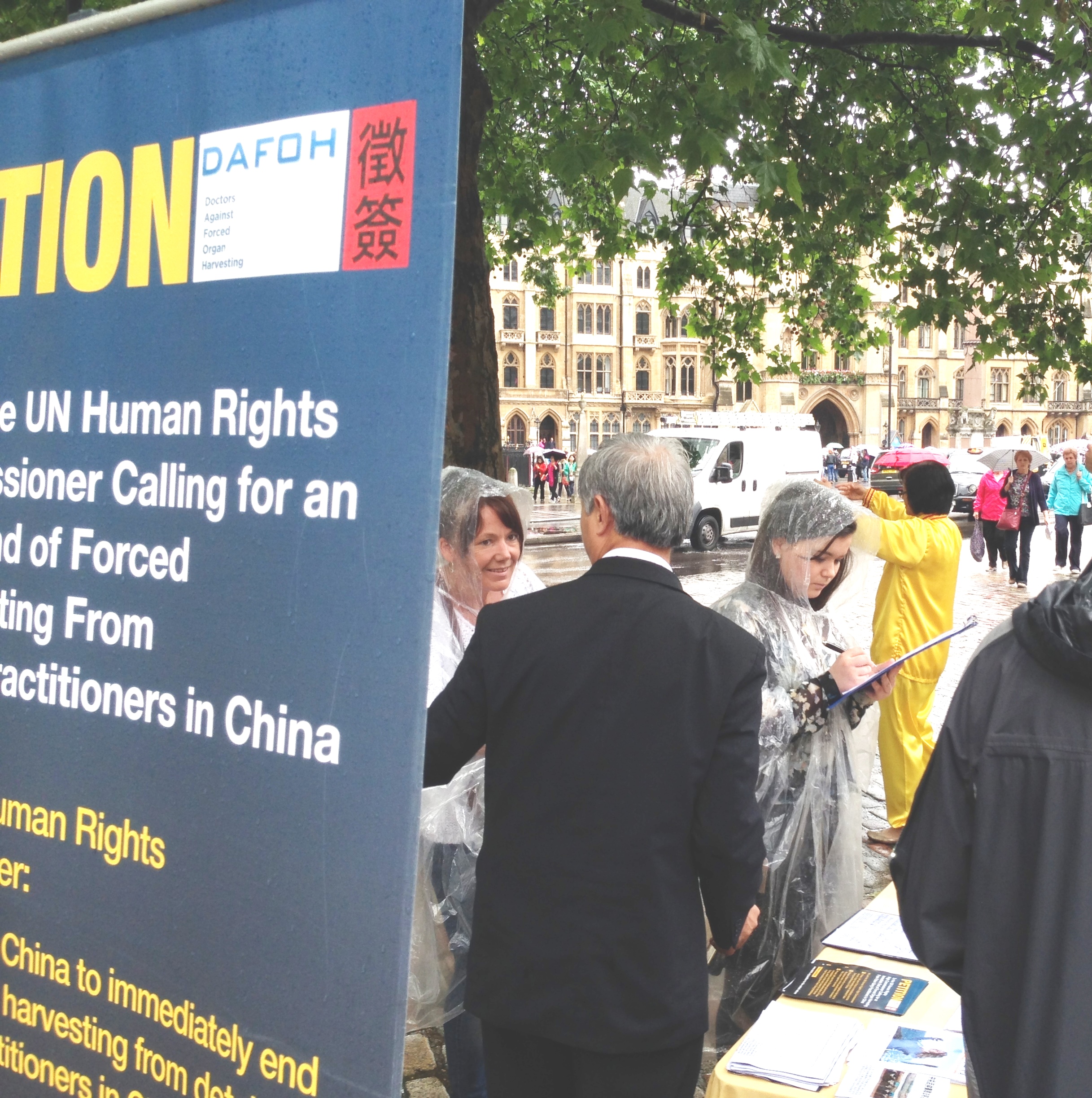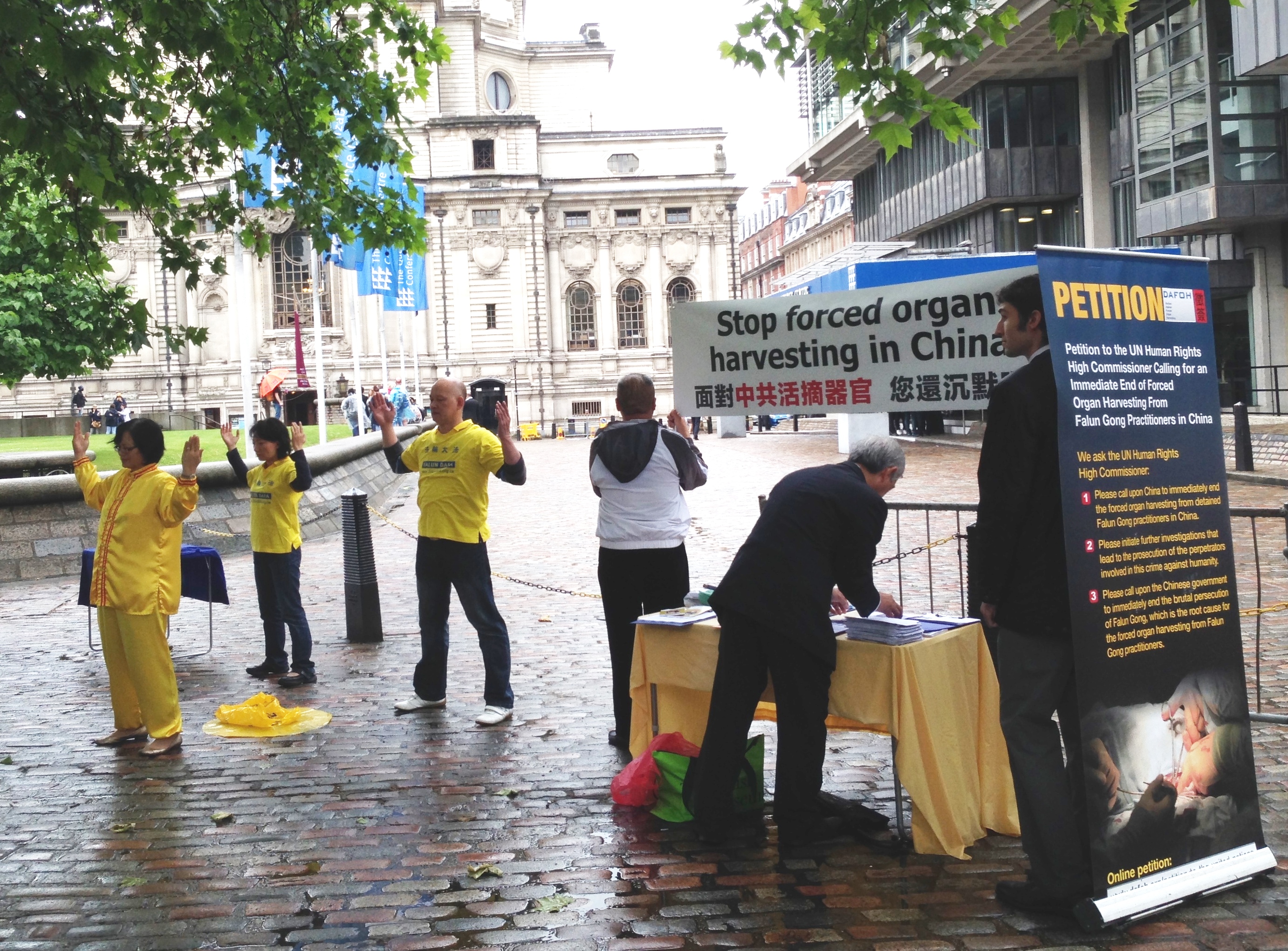 【明慧网二零一四年六月九日】(明慧记者唐秀明英国采访报道)二零一四年六月七日,在伦敦伊丽莎白二世会议中心(Queen Elizabeth II Conference Centre)召开的国际移植大会进行到最后一天,当天与会的代表们注意到会场外的人行道旁多了一道风景:“面对中共活摘器官,您还沉默吗?Stop Forced Organ Harvesting in China”的横幅旁,几位身着黄色服装的人伴着祥和的音乐演示舒缓的功法。印有“反强摘器官医生协会(DAFOH)”征签诉求的展板,立在横幅的另一侧。下雨时,这道风景依旧。