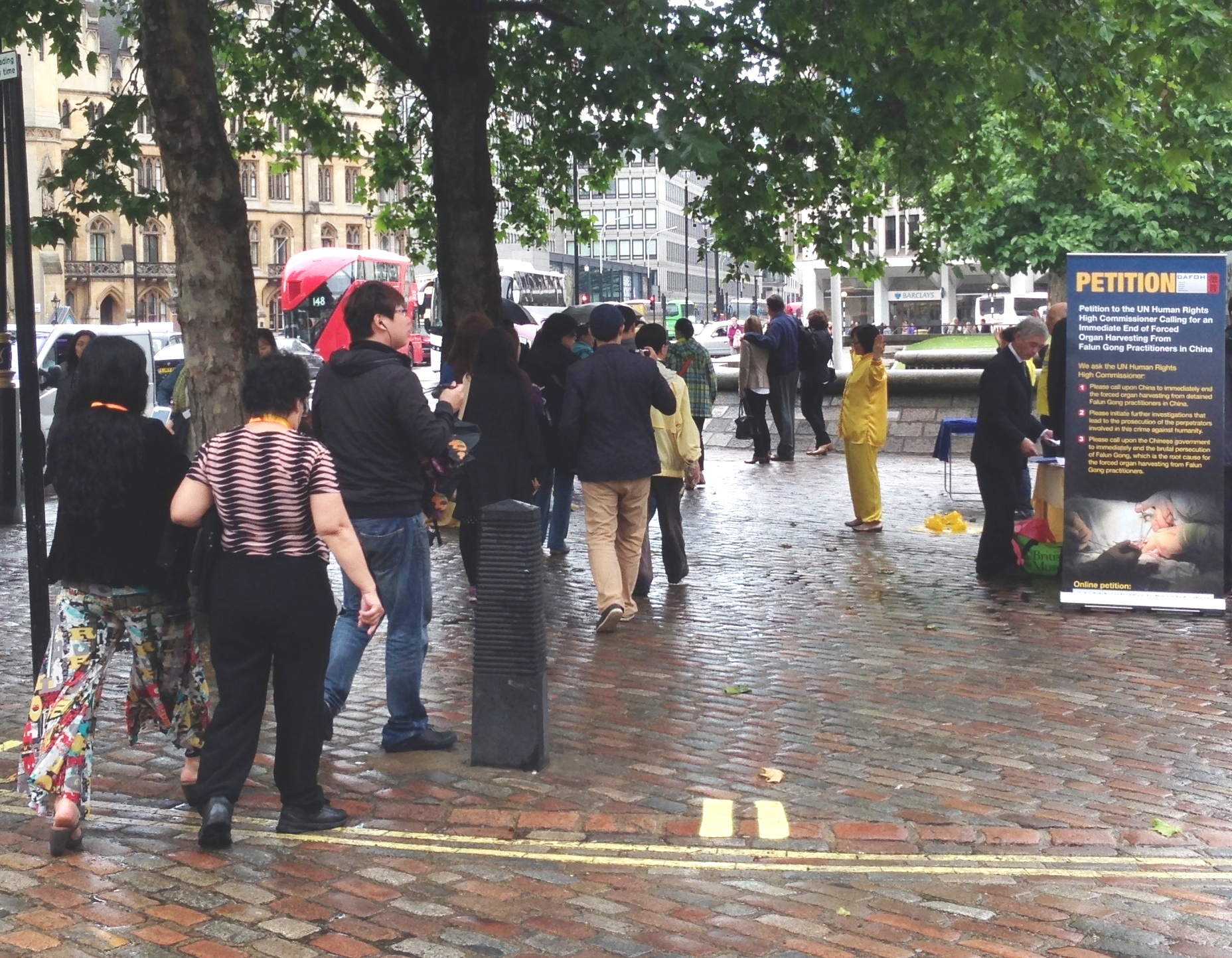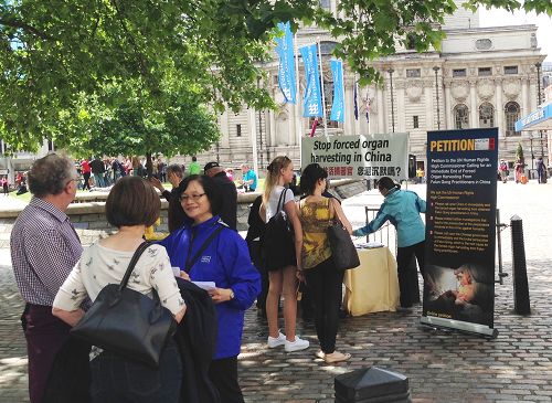 在法轮功学员举办活动的六个小时里,有多个中国大陆来的旅游团经过。一些人露出惊讶的表情,也许是他们没有想到会在大本钟和威斯敏斯特大教堂旁边遇到堂堂正正演示功法的法轮功学员,也许这是他们第一次听说“中共活摘器官”。很多人拍照、摄像,也有一些人加快脚步但把目光投向横幅和正在炼功的法轮功学员。其中一些人,往往是走在队伍后面的人会从法轮功学员手里接过真相资料。