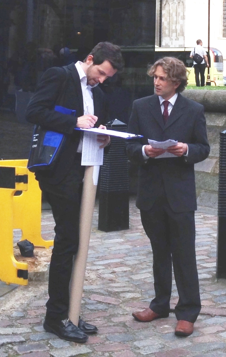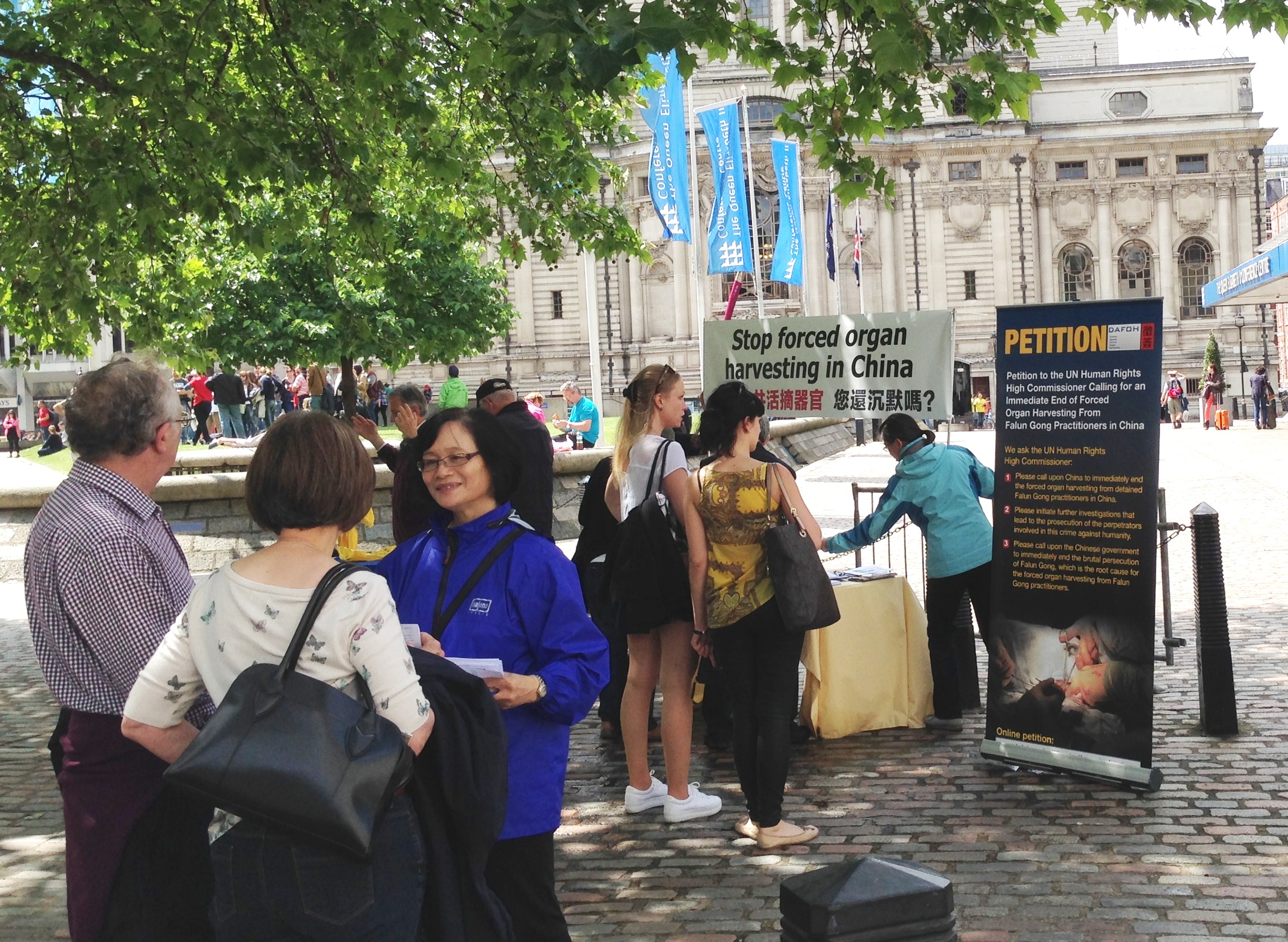 图1-2:二零一四年六月七日,法轮功学员在伦敦伊丽莎白二世会议中心外面炼功、讲真相、进行反活摘器官征签