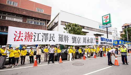 ![]() 图9:中共国台办主任张志军二十七日南下访高雄市长陈菊,法轮功学员高举“法办江泽民、罗干、周永康、刘京”,及“法轮大法好”的醒目横幅。 |