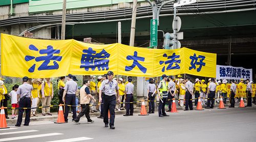 对法轮功学员坚毅、和平地表达心声,负责维持治安的台湾警察当场表示佩服,更有其他抗议团体高喊:“法轮功加油!”有的员警主动提醒法轮功学员,关怀学员的安全。被判有罪的“爱国同心会”成员张秀叶在饭店外诬蔑法轮功、并用身体刻意阻挡横幅,警方勒令他离开,到空旷地方去,不要滋事与干扰法轮功学员。