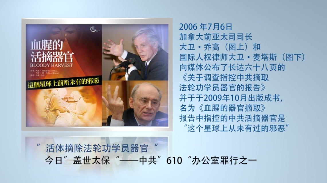 “不打任何麻药,刀在胸脯上,他们这个手啊一点抖都不抖,要是我下手我一定抖了。别看我在武警,我端过枪,我也进行过实弹演习。但是,我也见过很多死尸,但是看到他们,我真的佩服他们这些军医,手一点也不抖,直接戴着口罩拉出来。当时我们一人拿一把手枪在旁边站岗,那个女人就嗷……大叫一声,法轮大法好”。这是辽宁省锦州市的一名警卫目击的2002年4月一起活体摘取法轮功学员器官的描述,也是今日“盖世太保”——中共“610”指挥下的迫害法轮功学员的恐怖一幕。
