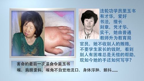2014年5月18日,前黑龙江阿木尔教委官员里玉书12年冤狱期满。在里玉书即将出狱的当天早晨,狱方突然强行给里玉书强制灌食。回到家的里玉书受到阿木尔林业局中共人员的24小时全天候监控。这样到了5月26日,里玉书突然站不起来了,半边身体麻木,嘴和脸都歪斜,并且急剧恶化。里玉书本人及亲友们都意识到,黑龙江省女子监狱出狱前的强行灌食,应是灌输有害药物,这是要置她于死地,以避免今后他们大肆跟踪监控的麻烦……