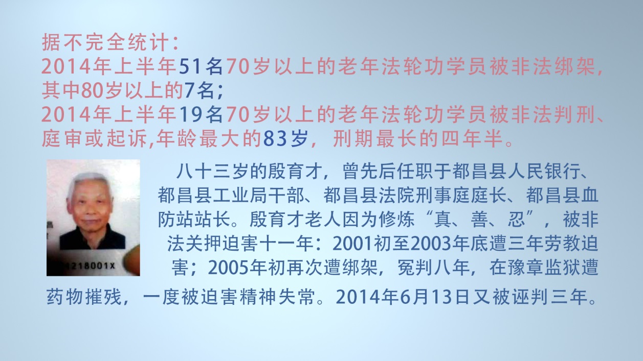 类似的迫害还延续到法轮功学员的亲人身上,2014年3月2日陕西刘红枢遭“610”骚扰,警察抄家时竟然威逼家中八十多岁的父母签字画押,造成老人受惊吓,大病一场。再如:2014年4月22日河北秦皇岛警察闯到王海金家非法查抄,把王海金70多岁的老母吓抽了,躺在地上,无人过问。
