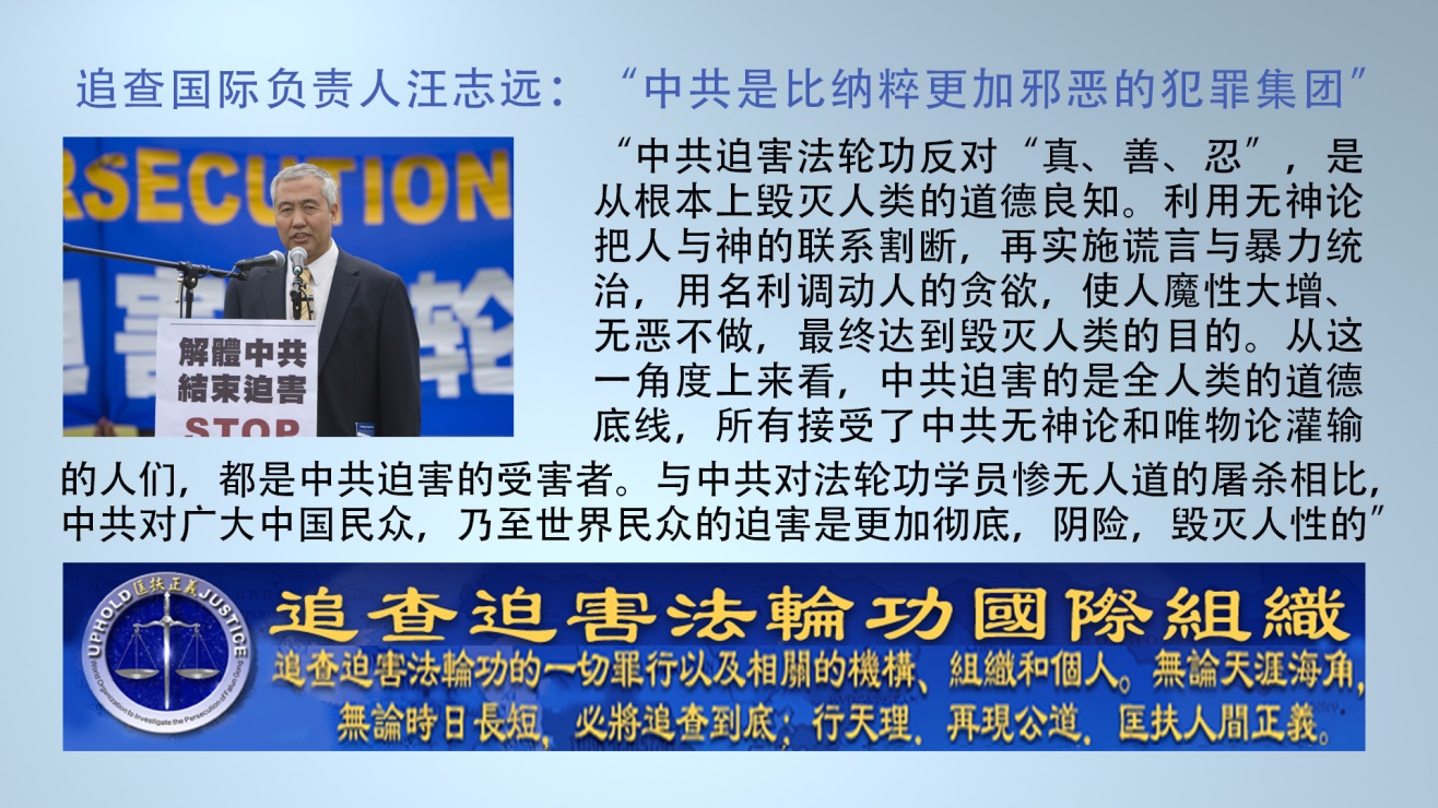 追查国际负责人汪志远2013年7月18日在美国国会山演讲表示,二战时期纳粹用死人做肥皂、化肥等,而中共活体摘取法轮功学员的器官牟取暴利;二战时日军的“731部队”用华人做细菌实验,是秘密的进行,而锦州市公安局的“现场心理研究中心”用活人做人体死亡过程试验,中共竟然授予了“光华创新特别贡献奖”并资助科研经费200万元……”