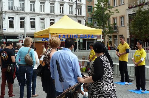 七月十九日,比利时法轮功学员在首都布鲁塞尔举办讲真相活动,谴责中共对法轮功的残酷迫害。一群中国留学生好奇地询问是什么让这群西方人开始修炼源自东方的法轮功的。