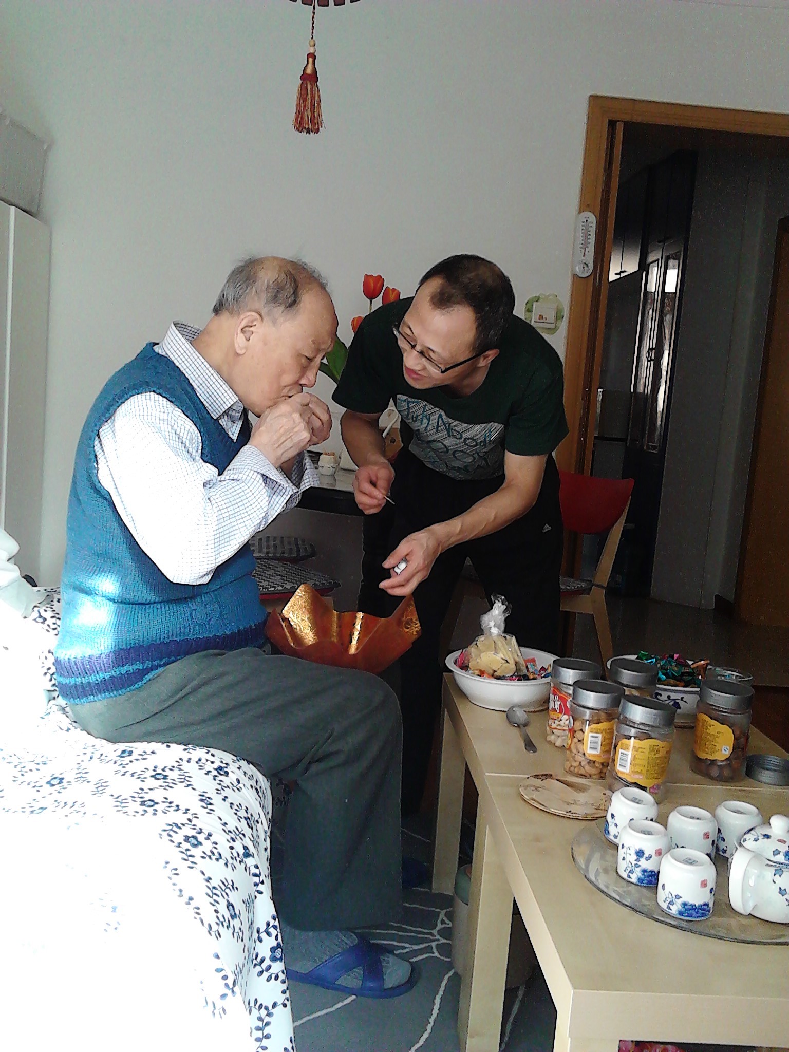 洪波在给父亲剥坚果吃