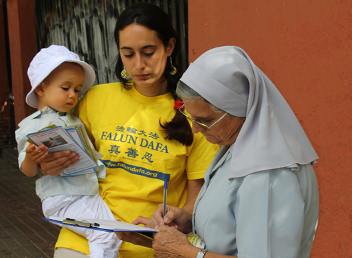 一位修女接过真相传单,在了解到在中国有那么多法轮功修炼者遭到残酷迫害,非常难过,她表示要为那些被迫害而仍然勇敢坚持真理的法轮功修炼者们祈祷,送上最美好祝福。她在征签表上签上了自己的名字。