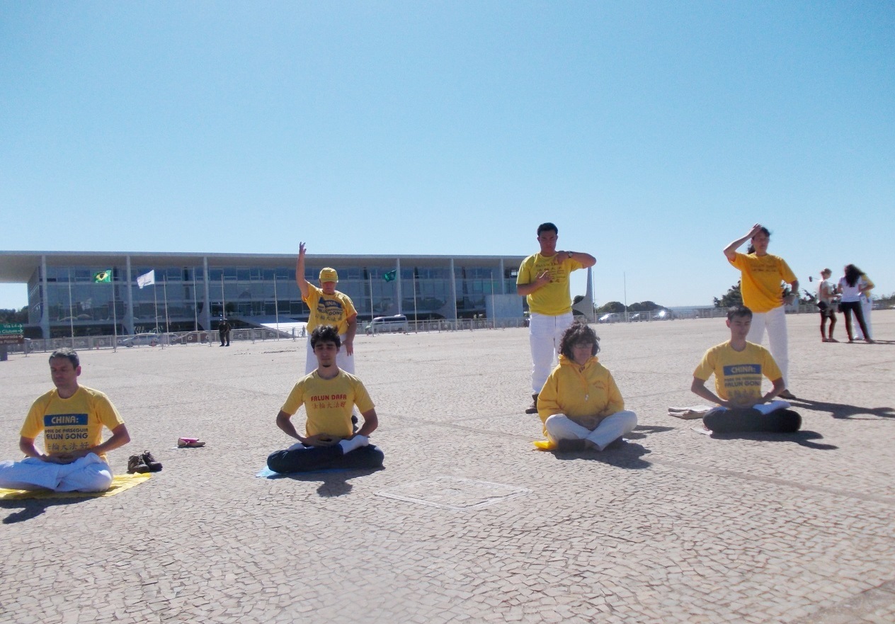 七月十六至十七日,法轮功学员在巴西首都巴西利亚政权中心三权广场(“三权”即总统府、议会大厦及最高法院)上拉起横幅、炼功、澄清真相、展示反迫害的坚定信念,并向参加多国会议的各国元首揭露中共的邪恶本质。