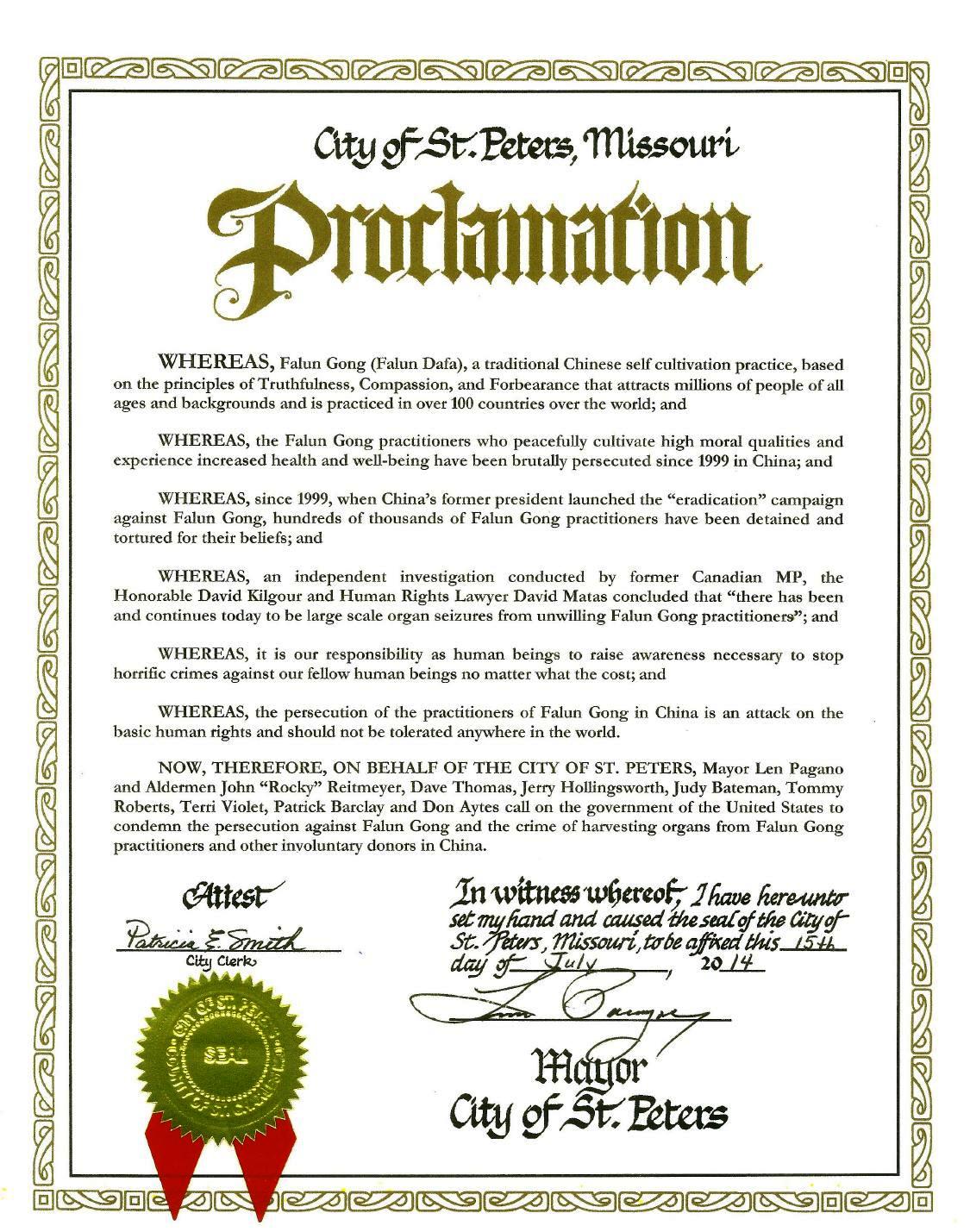 因此,代表圣彼得市的所有居民,市长雷•帕格诺和市议员们约翰•洛奇•赖特迈尔(John “Rocky” Reitmeyer),戴维•托马斯(Dave Thomas),杰里•霍林斯沃思(Jerry Hollingsworth),朱迪•贝特曼(Judy Bateman),汤米•罗伯茨(Tommy Roberts),特丽•维尔莉特(Terri Violet),帕特里克•巴克利(Patrick Barclay),唐•埃蒂斯(Don Aytes),特此呼吁美国政府谴责中国对法轮功的迫害,谴责活摘法轮功学员器官和其它非自愿捐助器官的罪行。